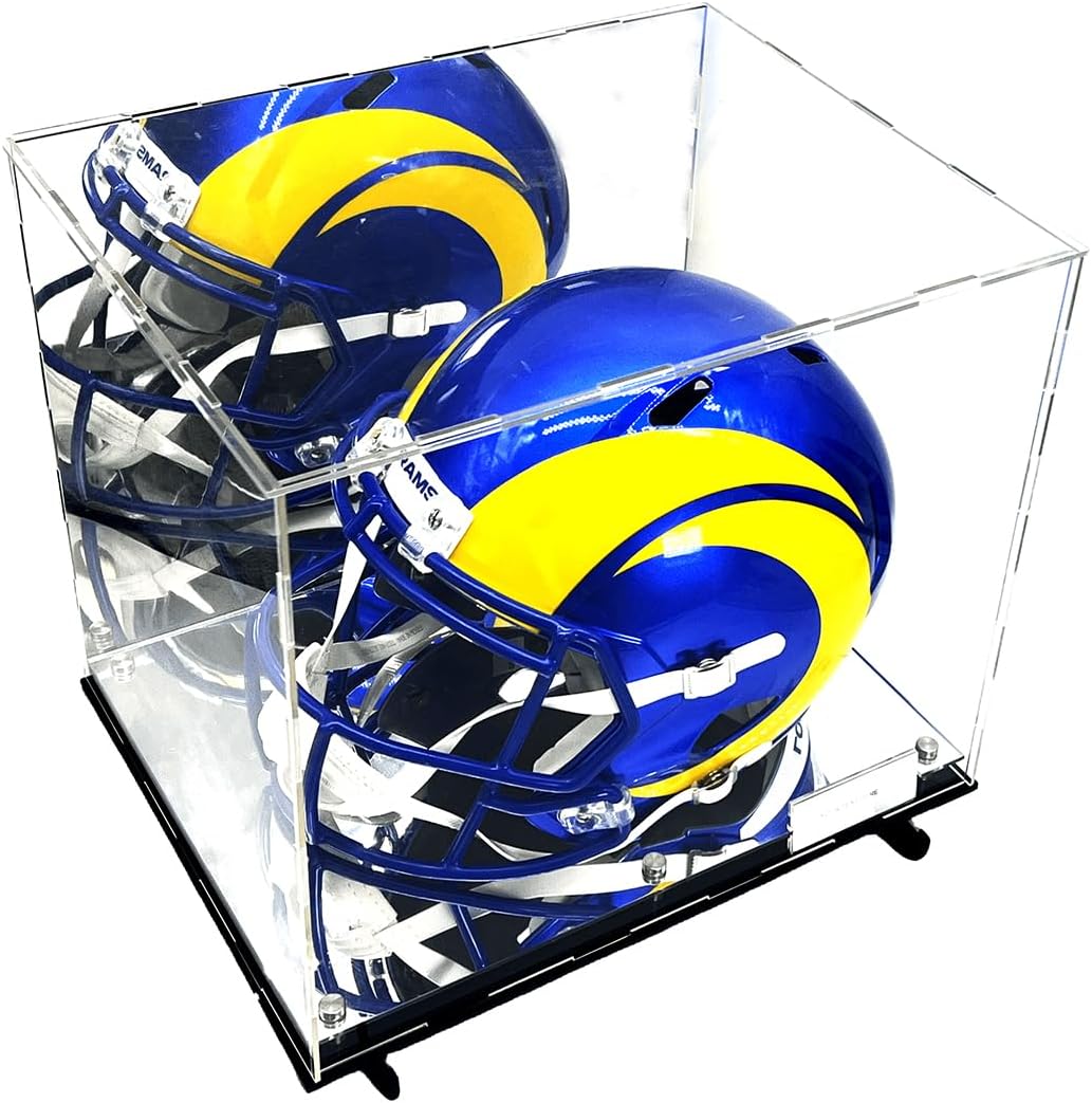 For Full Size Football Helmet Acrylic Display Case with Wall Mount Brackets & Screws Included. Features a Mirrored Background & Platform, 2 Level Riser, & Name Plate. UV Protected Panels